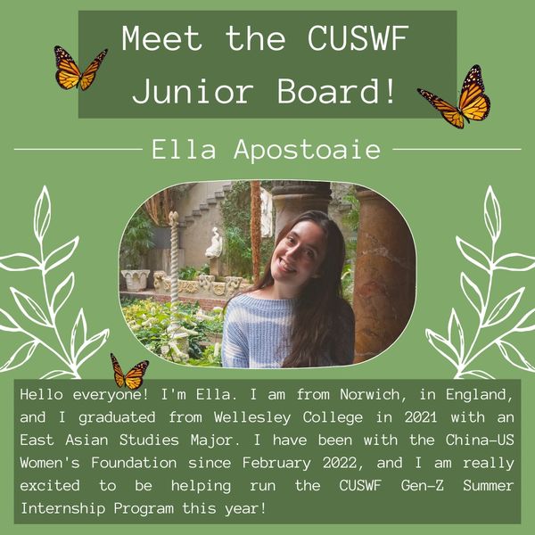 "Hello everyone, I'm Ella Apostoaie! I graduated from Wellesley College in 2021, but I am originally from Norwich in England. My passion for languages led me to study Mandarin in college, and from there I developed a keen interest everything China related - from Chinese cinema, to Chinese philosophy, to Chinese science fiction! I ended up with an East Asian Studies major, and I was lucky enough to meet Leslie Wolf-Creutzfeldt at a Wellesley networking event where she introduced me to the China-US Women’s Foundation!"