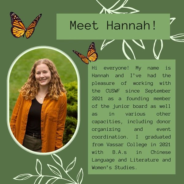 "Hi everyone! My name is Hannah and I’ve had the pleasure of working with the CUSWF since September 2021 as a founding member of the junior board as well as in various other capacities, including donor organizing and event coordination. I graduated from Vassar College in 2021 with B.A.s in Chinese Language and Literature and Women’s Studies. I recently moved from Washington, D.C. to Madison, WI, where I work in healthcare software (while being the sole junior board member representing the Midwest). Working with the CUSWF has been a really fun and rewarding experience, and I look forward to our plans for the future, such as continuing our Gen-Z forums to cover more topics, as well as expanding on our Zero-Waste challenge from our last forum!"