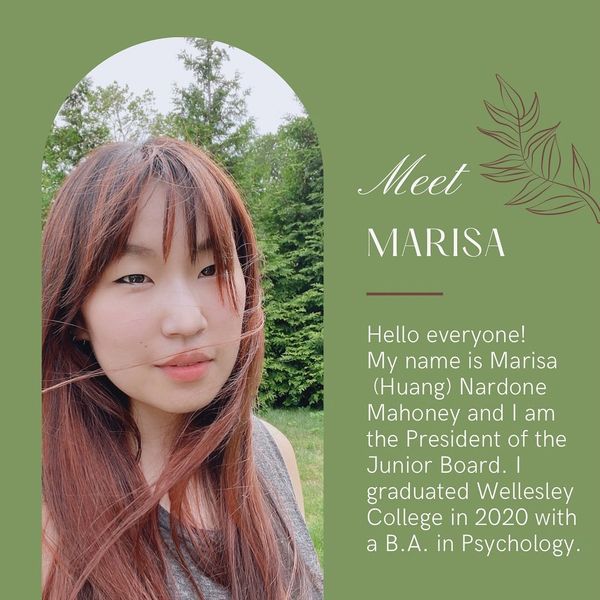 "Hello everyone! My name is Marisa (Huang) Nardone Mahoney and I am the President of the Junior Board. I graduated Wellesley College in 2020 with a B.A. in Psychology. I was adopted from Hubei, China and grew up in a suburb of Boston. I am fascinated by the intersection of cultures, particularly as it pertains to multicultural and immigrant youth and young adults. I joined the China-US Women’s Foundation in June, 2020 and have assisted with the organization of several Gen-Z Global Forums. It has been a privilege to meet and work with Leslie, Mingyi, and Leslie, as well as the many wonderful partners of the Foundation. As a member of the Junior Board, I am eager to continue organizing events and developing events that explore the issues that we are most passionate about."