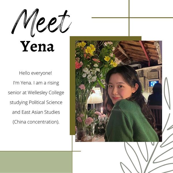 "Hello everyone! I'm Yena. I am a rising senior at Wellesley College studying Political Science and East Asian Studies (China concentration). I am from Seoul, South Korea, and this fall I will be studying International Development in Geneva, Switzerland. I've been with the CUSWF since the summer of 2021, and it has been a pleasure to work on the CUSWF with such inspiring and passionate women. Our Junior Board hosted a Gen-Z global forum and a Film Festival focused on climate change and sustainability this year. We plan to explore more issues in the future and look forward to engaging in meaningful conversations and events!"